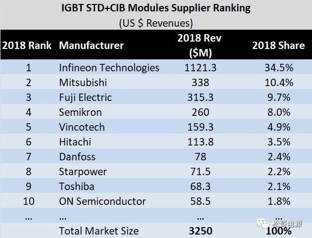 根据全球著名市场研究机构IHS最新报告,2018年尊龙凯时半导体Starpower在全球IGBT模块市场排名第八,并且是唯一进入前十的中国企业。